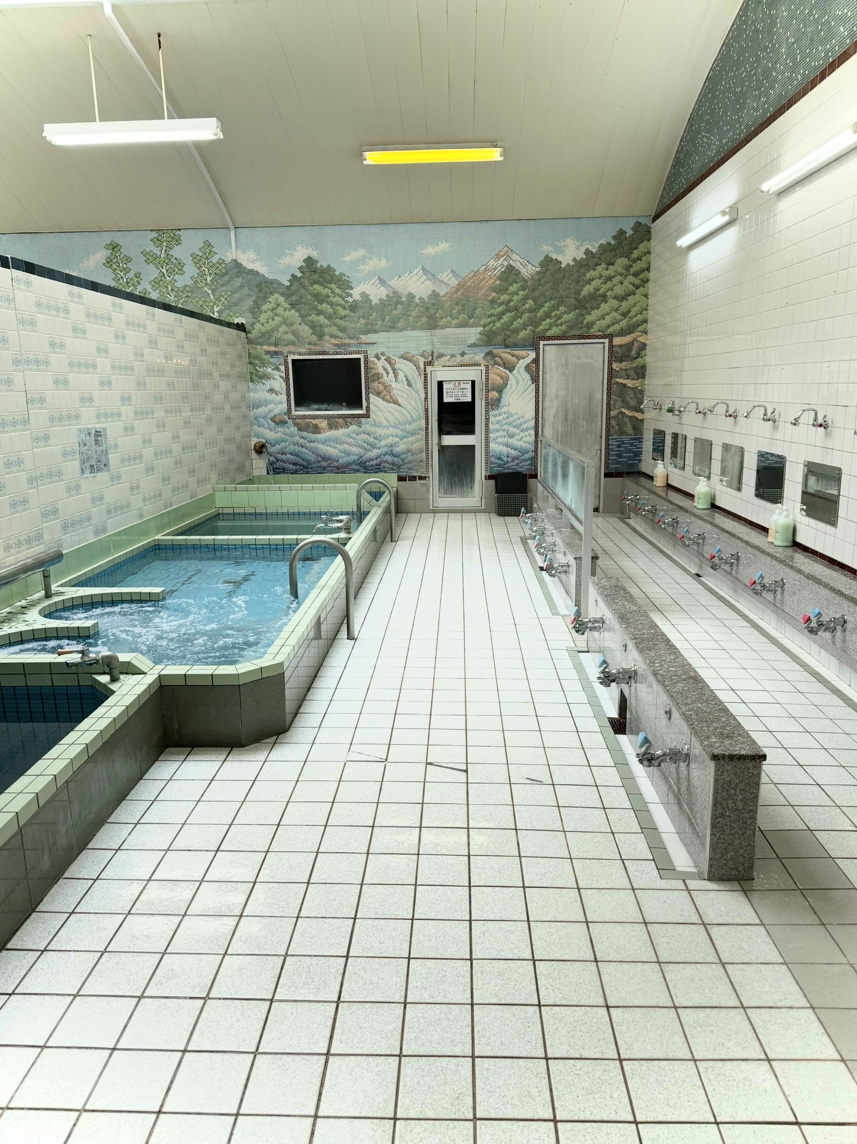 浴場には、山や川、森を描いた西洋風のモザイクタイル絵が壁一面に広がり、壮観です。浴槽は、電気風呂ジェット風呂熱めの深風呂、そしてラベンダーやカモミールの薬湯など種類が豊富。