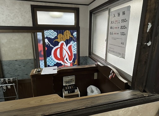 遠くからでも目を引く赤いネオンサインの温泉マークと、油井型の特徴的な煙突が目印です。歴史を感じさせる建物に入ると、番台は前開きの京都スタイルで、柔和な笑顔の大将が迎えてくれます。