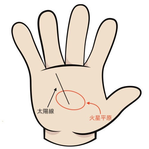 「太陽線」は薬指(太陽指)に向かう線で、通常「名声」「人気」「成功」「金運」を示します。 その線が「手のひらの中央(火星平原)」から始まっているのがこの相の特徴です。「火星平原」は「闘争心」「忍耐力」「実行力」「困難」を司るエリア。