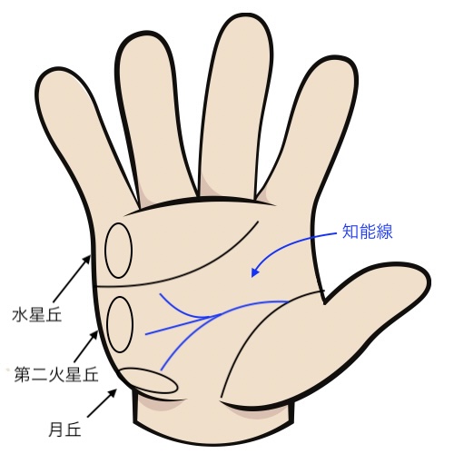 「知能線(頭脳線)」は、その人の思考パターン才能判断力を示す重要な線です。通常、知能線は一本ですが、ポアンカレの知能線は三叉に分かれ、それぞれ異なる丘(エリア)に向かって伸びています。