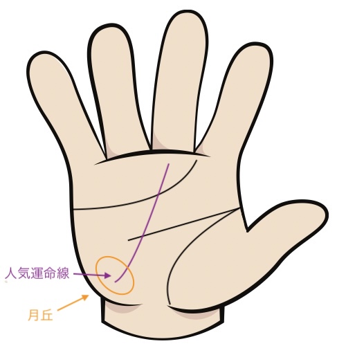 この線が、**小指側の手のひらのふくらみ(月丘)**を起点として伸びているのが「人気運命線」の特徴です。