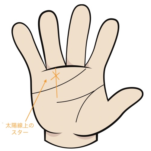 • 場所: 薬指の付け根のふくらみ(太陽丘)に現れる、太陽線の上、または太陽線と重なるように現れるスター(星印)です。