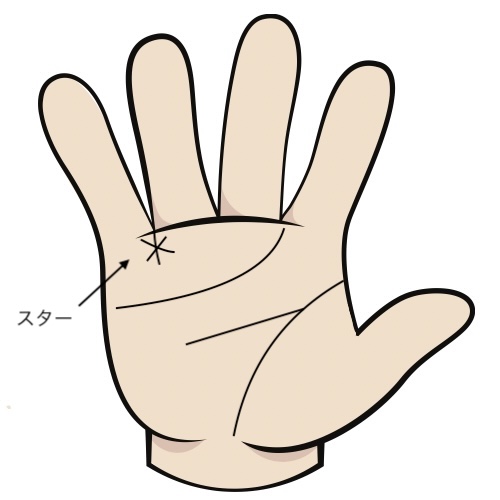 「スター(星紋)」は、3本以上の線が一点で交差してできるアスタリスク(星)のような形をした手相の吉相の一つです。その星が現れる場所によって、意味合いが大きく変わります。