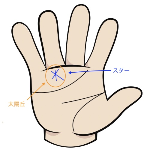 「スター(星紋)」とは、三本以上の短い線が交差して星のような形を作っている紋様のことです。スターが現れる丘の意味を何倍にも増幅させる作用があり、特に「太陽丘」にある場合、その意味合いは極めて強力になります。