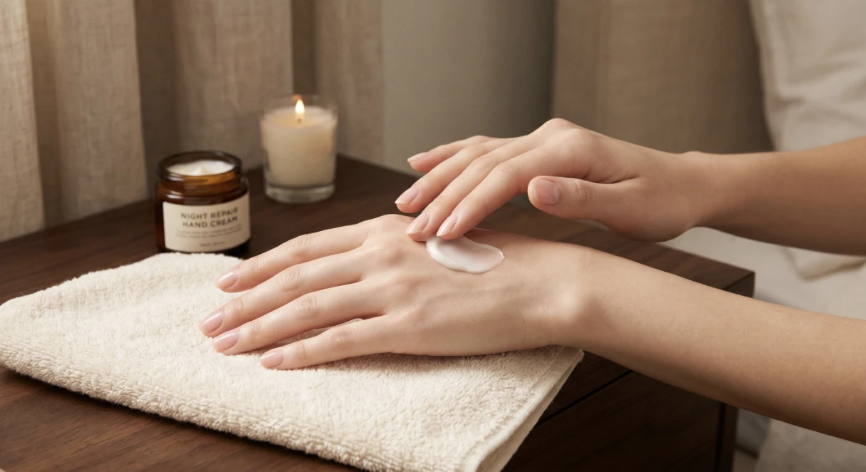 STEP 5:ハンドクリームで仕上げ(任意) オイルが浸透したあと、さらにハンドクリームを重ねると保湿力がアップします。オイルで油分を補い、クリームで水分と油分のバランスを整えるイメージです。